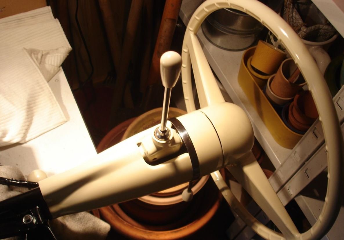 Allerdings hat sich die die Lenksäulenverschiebung die Getriebevorwahl soweit verstellt, dass ich trotz maximaler Endeinstellung am Getriebe nicht mehr richtig von der 3.-4.-Gasse auf die 1.-2.-Gasse umschalten konnte. Das wiederum habe ich nun so gelöst, indem ich das Vorwahlgestänge an der Spritzwand (durch Ausnudeln der Löcher) etwas höher angesetzt habe. Die nächste Probefahrt (im Frühjahr) wird zeigen, ob das reibungslos funktioniert. Ich bin guter Dinge - trotzdem bleibt es etwas merkwürdig, warum die Teile so "verschoben" sind.