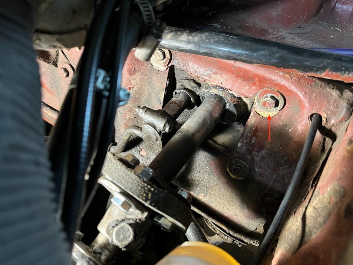 Es ging wieder ein bisschen voran. Ich habe das Lenkrad und die Teile dahinter (Gummi-Pertinax-Lagerung, Blinkschalter, etc.) demontiert. Als erstes ist mir aufgefallen, dass die Lenkstange verspannt ist und durch die Spritzwand-Durchführung nach unten gedrückt wird und somit oben am Ende der Lenksäule nicht mittig ankommt. Ich konnte die Durchführung ca. 5mm nach oben verschieben (siehe Bild) und die Verspannung somit lösen. Seitdem geht zu meiner Freude die Lenkung und auch Schaltung viel besser (weniger Kraftaufwand, keine Schabgeräusche).