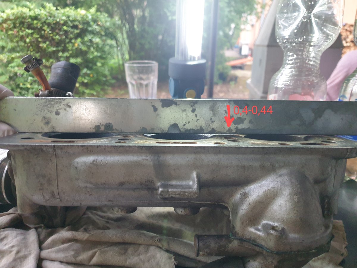 Abseits er "akademischen Betrachtungen" habe ich mal den Zylinderkopf bzw. die Abweichung von der Planfläche mit den vorhandenen "Hausmitteln" (Stahlwinkel + Fühllehre) gemessen. Bei Messung über die Länge beträgt die maximale Abweichung ca. 0,43 bis 0,44 mm.