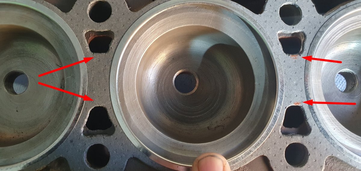 Aus dem Traktorenbereich kommend, sieht das hier für mich nach einem Kavitationsschaden aus, was an der Stelle auch Sinn ergeben könnte weil der Kühlkanaldurchlass von der Kopfdichtung doch derbe reduziert wird und just bei diesem Zylinder (Getriebeseite) auch die seitlichen äußeren Küjlkanäle fehlen, die in den Zylinderkopfdichtungen aber immer mit drin sind, ebenso wie augenscheinlich die zwei zusätzlichen Löcher Mitte-vorn und -hinten wo zwei zuätzliche Stehbolzen scheinbar vorgesehen wären.