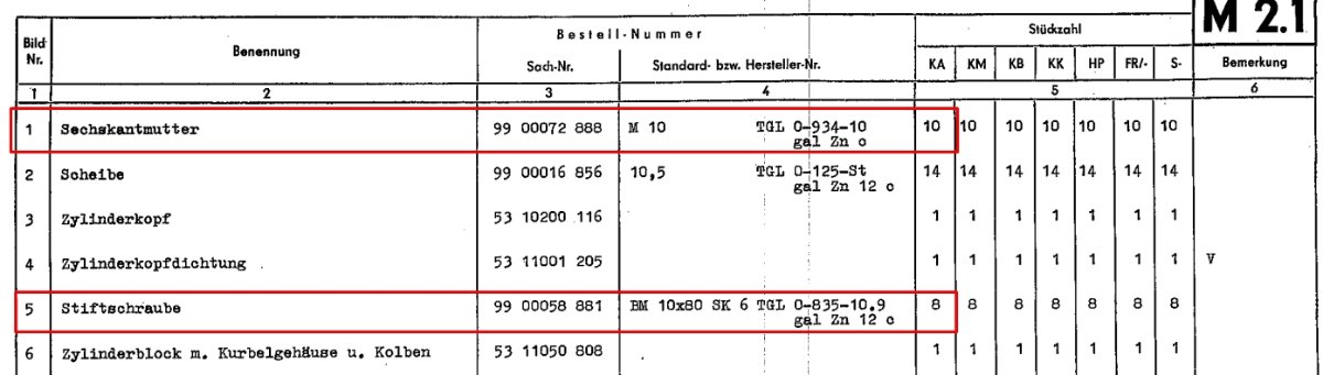 Es wird darin wie auch gelegntlich anderswo auf Zylinderkopmuttern in 10.9er Güte verwiesen, im Ersatzteilkatalog sind es original wohl aber doch nur 8.8er während die Stehbolzen original 10.9er sind.