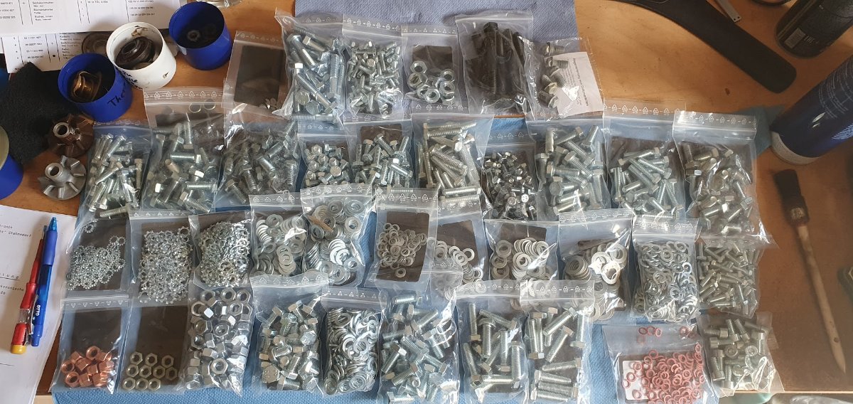 Auch da - genug Schrauben fürs wieder zusammen bauen und ja, ESKA wäre mir auch lieber gewesen, aber die alle in neu ran zu bekommen oder alte aufarbeiten lassen würde bei mir den zeitlichen Rahmen dann doch sprengen. Auch hätte ich lieber mattverzinkte bekommen, aber die konnte ich nicht in allen Abmessungen auftreiben, also am Ende dann doch normal verzinkte.