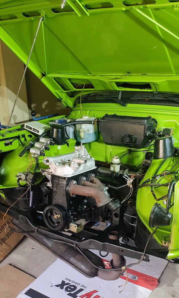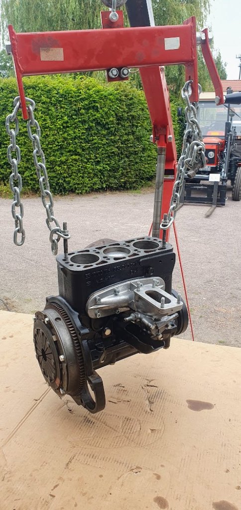 Ansonsten war der Zusammenbau relativ unproblematisch, wir haben den Motorblock mit 2 alten Stehbolzen versehen mit Balancer am Werkstattkran aufgehängt in den Wartburg eingeführt und mit dem Getriebe verheiratet. Der Wartburg steht bei mir ja noch auf der Arnoldbühne, also vorn etwas angehoben, was die Montage erleichtert da man von allen Seiten recht gut ran kommt.