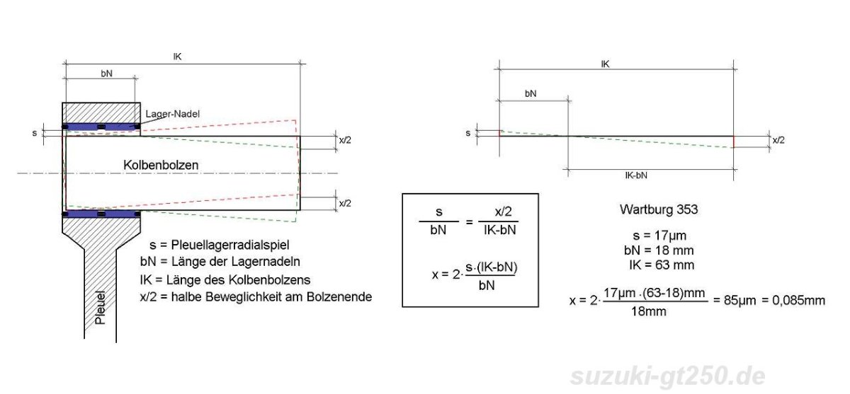 im Bild links das Pleuel im Schnitt mit einseitig bündig eingesetztem Lager und Kolbenbolzen, das Radialspiel ist zur Verdeutlichung übertrieben dargestellt, die mögliche Kippbewegung des Bolzens in gestrichelten Linien.