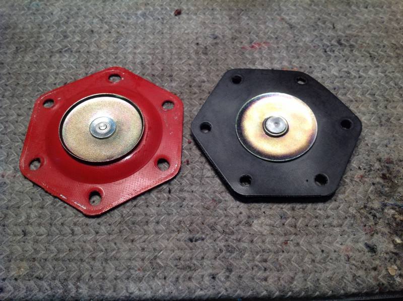 Man schaue sich einmal die Wölbung der roten, damals aus der Pumpe ausgebauten Membran an (die schwarze ist/war neu und zum Vergleich)! Um genau die Höhe der Wölbung ist damit der Hub der Pumpe verringert und natürlich die Förderleistung eingeschränkt. Da die Membran an sonst heil ist, war im Normalbetrieb auch nichts zu merken, hierfür reichte die Fördermenge dann wohl noch. Eingebaut war die Membran übrigens so ca. 10 tsd. km, lange gehalten hat sie daher nicht. Ich habe daher gleich Nägel mit Köpfen gemacht und fahre nur noch mit E-Pumpe.