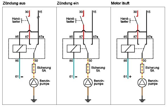• Wird die Zündung dann eingeschalten, zieht das Relais an, da nun Spannung an der 15 anliegt und die Masse immer noch über 61 kommt. Nun entsteht ein Strompfad vom Handtaster über die Klemmen 87 und 30 zur Pumpe, man kann also "Vorpumpen" bis die Pumpe selbst abschaltet. Eine selbstständige Funktion der Pumpe über die 15 ist jedoch nicht möglich, da jetzt die Klemmen 30 und 87a des Relais getrennt sind.