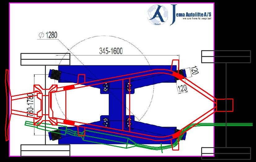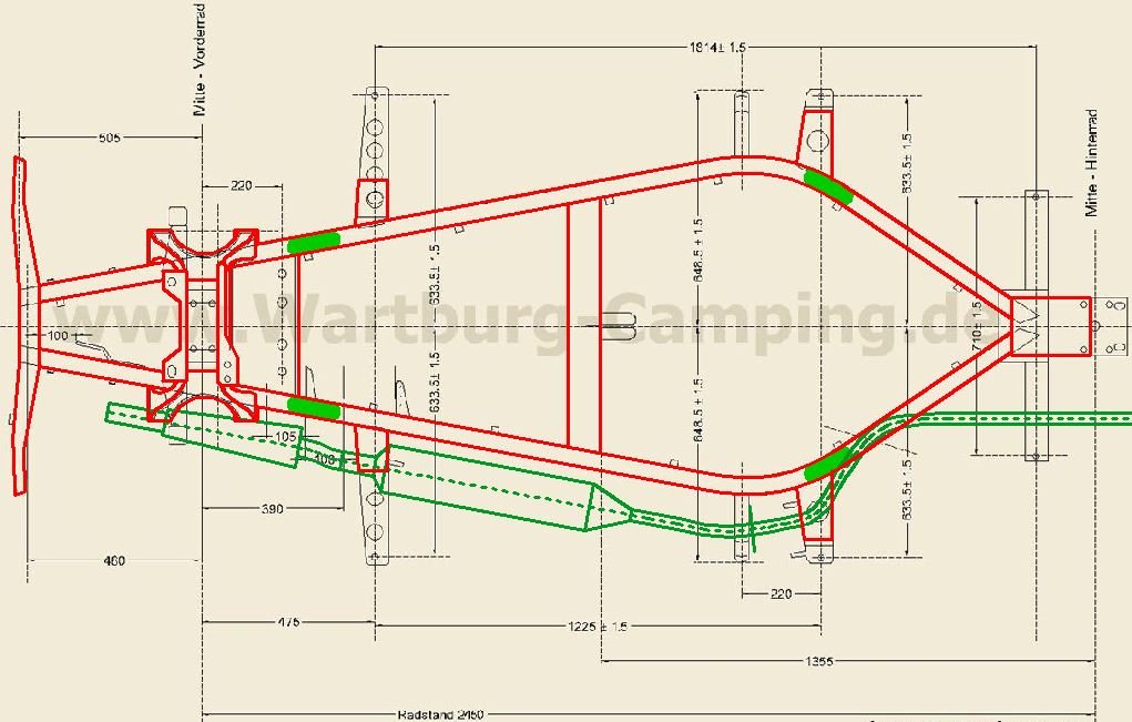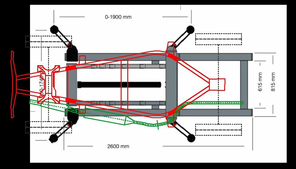 Ich kann nur noch einmal betonen, dass ich keinen Lift gefunden habe, welcher per se unter den Rahmen des F9 gepasst hätte und dass dann das gleiche auch für den 311 gilt, Hier mal der Rahmen vom F9 (rot) über den vom 311er gelegt, der Auspuff ist eingetragen und die möglichen Anhebepunkte in grün auch: