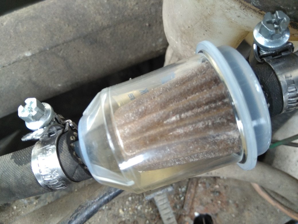 Erstaunlicherweise sind bereits wieder deutlich sichtbare Ablagerungen in dem neuen Benzinfilter zu finden - und das nach nur 33 km Fahrt und einem zuvor von uns gereinigten Tank :roll: