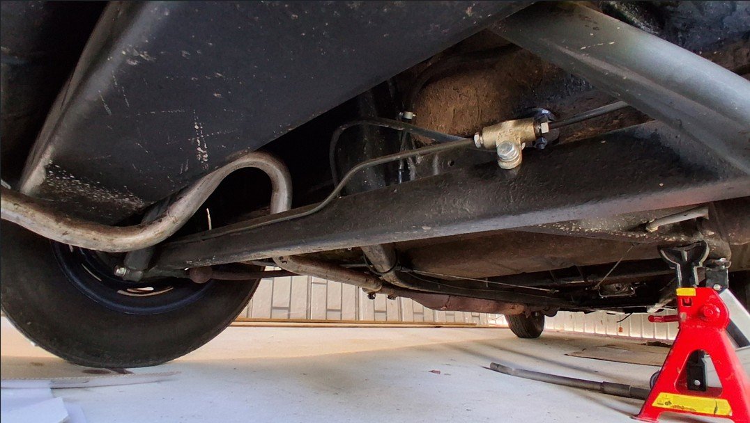 Etwas anders als bei mir sind bei Dir die Stoßdämpfer oben aufgehängt, denn diese stehen schräger als bei mir. Erstaunlich find ich aber, dass Dein Auspuff ohne Aussparung am Tank unter das Auto passt, auch wenn es hier ziemlich eng aussieht. Bei mir hat der Tank sogar noch zwei weitere Ausklinkungen für die Befestigungsschrauben der Stoßdämpfer an der Achse. Wer weiß, was man da bei Dir früher alles gebastelt hat :)