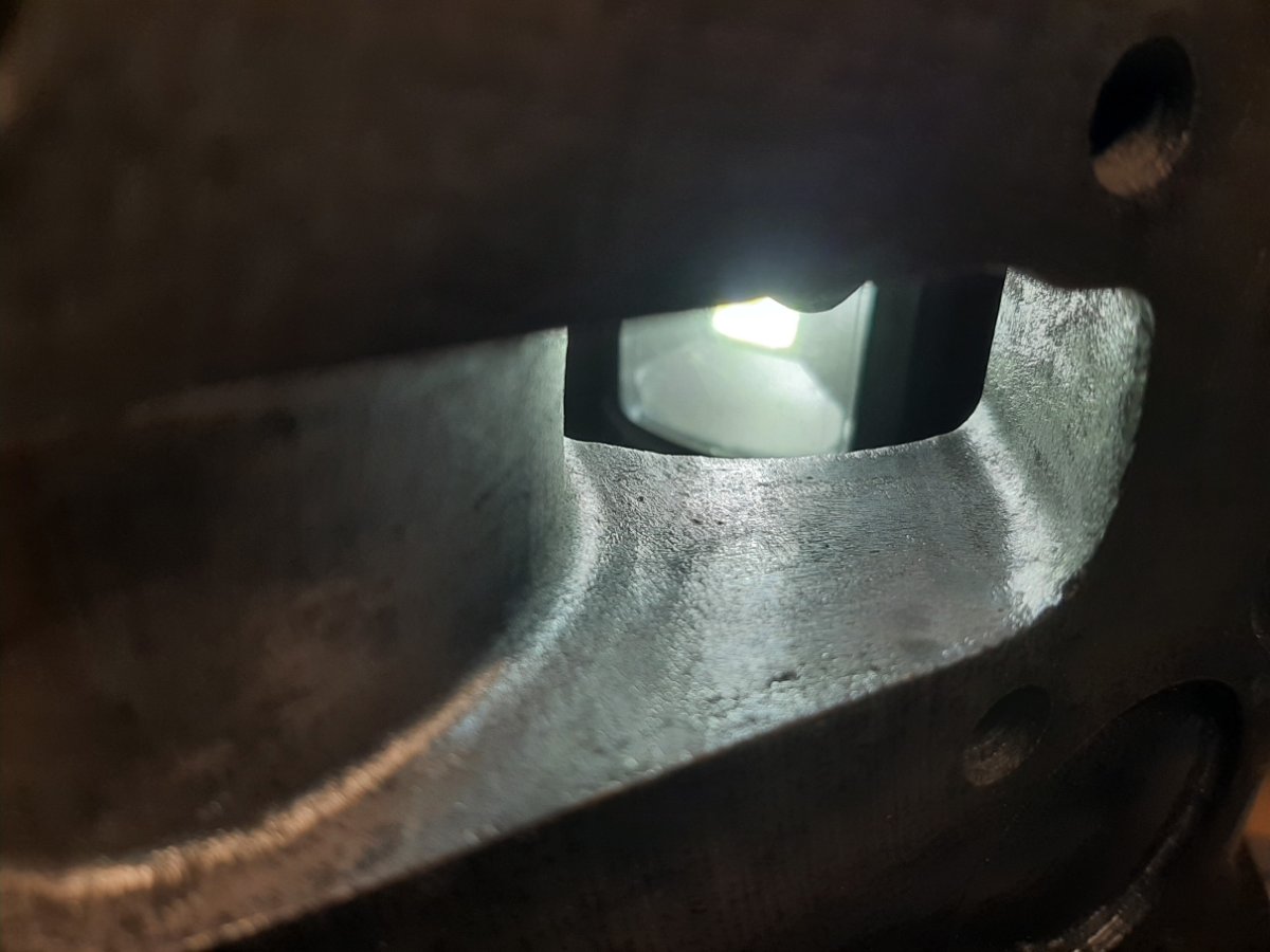 Bei meinem frisch geschliffen Block habe ich jetzt die Gussreste entfernt und die Kolbenfenster entgratet.