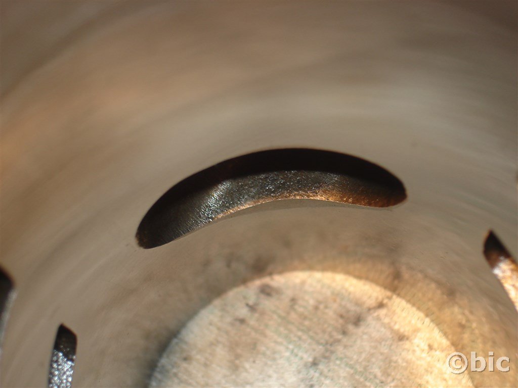 In der Praxis sind jedoch vor allem die Kanäle vor den Schlitzen so ungenau gegossen, dass hier zu Querschnittsverringerungen kommt. Die Kanäle sollte man daher auf Zeichnungsmaß bringen, was dann ungefähr so aussieht (mit etwas Pech muss man dann noch den Vergaserflansch anpassen):