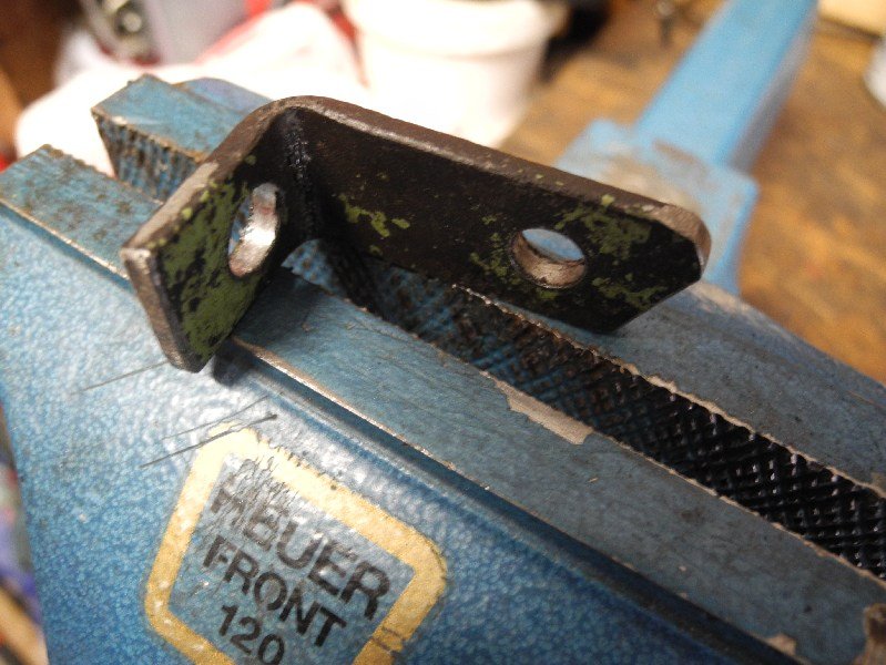 Die Idee ist jetzt (eigentlich bic Grundidee) das ich einfach eine längere Schraube M8 nehme (45 mm)die durch das Gehäuse wieder drehe ,so das dieses wieder am Punkt fixiert ist und auf das überstehende Schraubengewinde den Winkel 50 mm lang 20 mm das abgewinkelte Stück ,5mm stark sowie 20mm breit,2x Bohrungen M8 . Dann ,mittels Mutter/Federring anschraube. Das im Weg stehende Bruchstück flexe ich einfach plan und habe somit genug Platz für den Winkel.