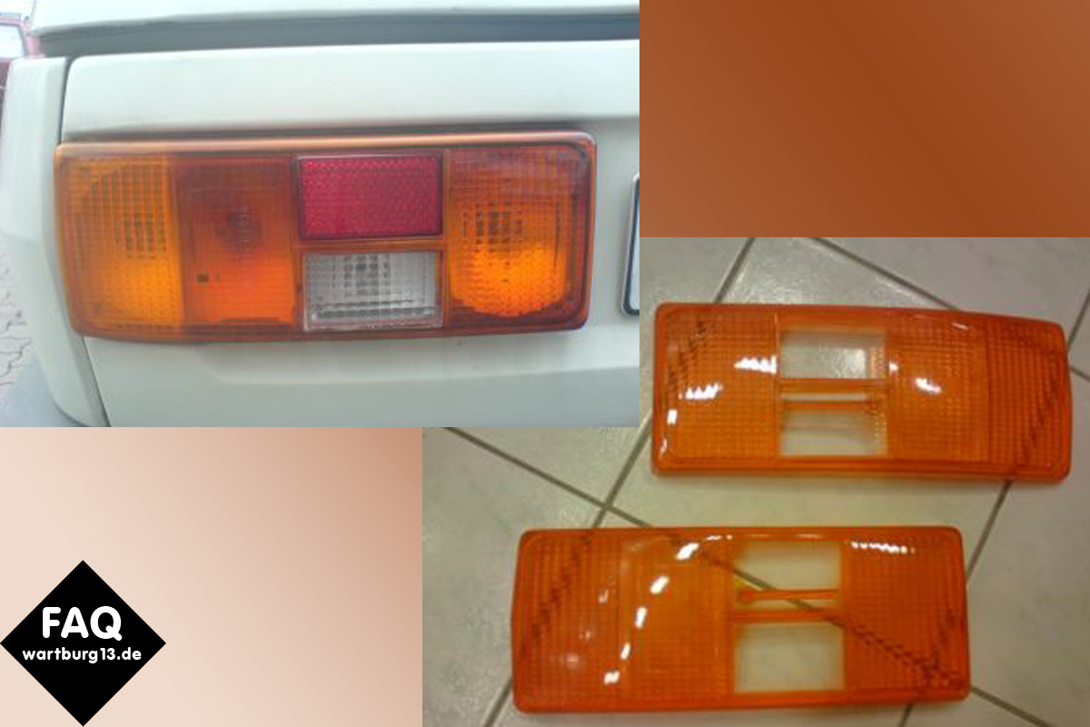 * dunkel getönter weißer Blinker aus dem Zubehör (LDM, Reich, Danzer,...), schwarzer Reflektor mit "Wartburg" Schriftzug in orange bzw. grün