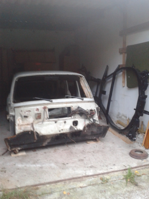 Hier noch ein kleiner Einblick vom Wochende. Die Karosse steht in der Garage, daneben schon der überarbeitete Rahmen. Die Einzelteile vom Rahmen liegen schon alle bereit. Müssen nur noch zusammengesetzt werden.