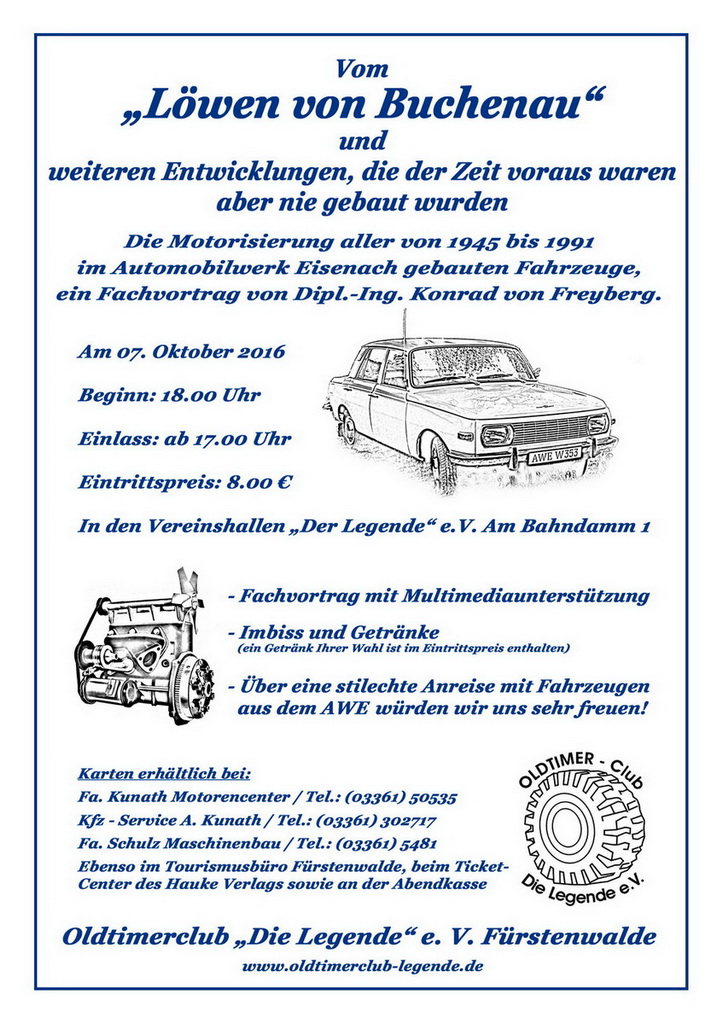 Der Oldtimerclub "Die Legende" in Fürstenwalde lädt ein, zum Fachvortrag zur AWE Motorengeschichte 1945 -1991.