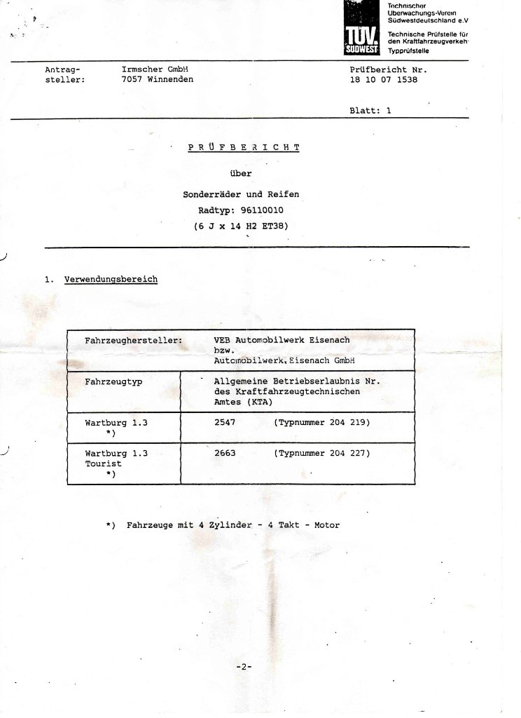 Re: Gutachten Irmscher Felgen Wartburg 1.3 / 353