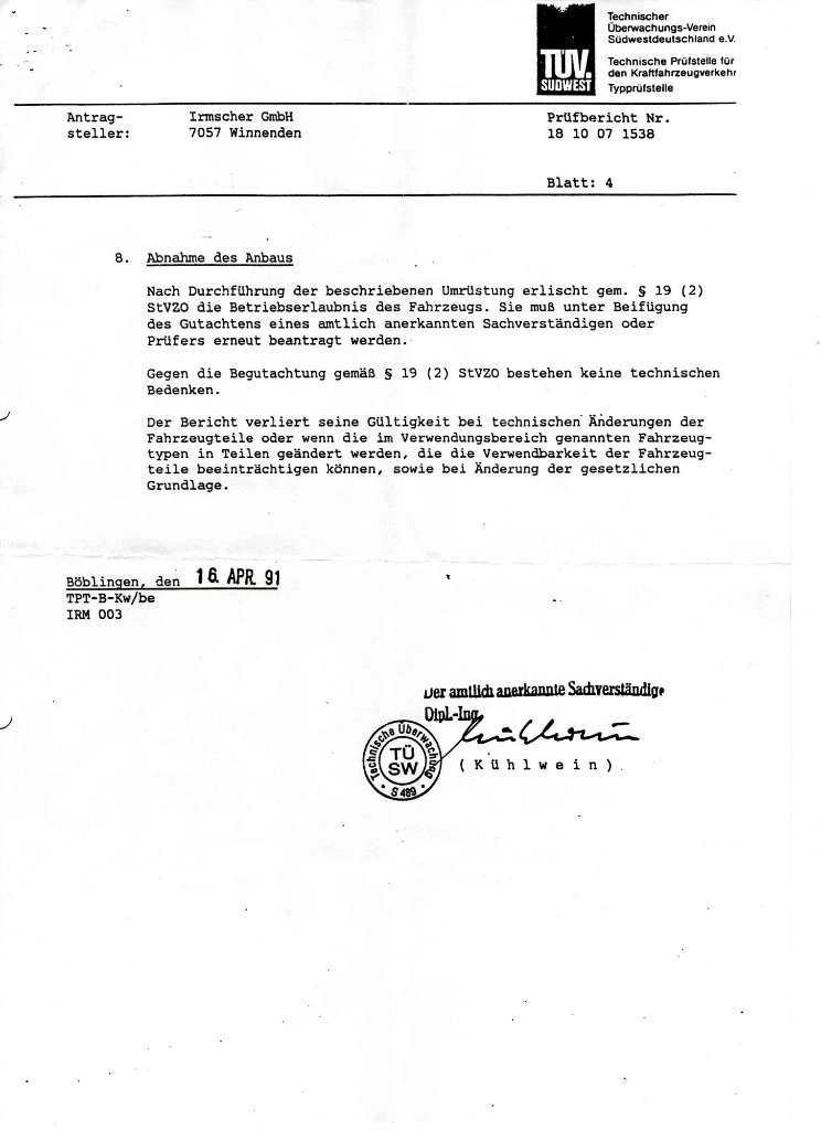 Da am Mittwoch das H-Gutachten für unseren "geretteten" 353 ansteht, benötige ich recht dringend das Gutachten für die Irmscher Felgen.