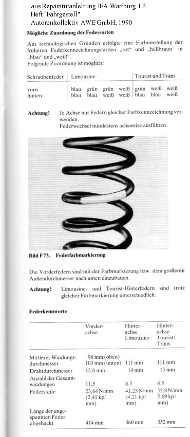 die Federn sind alle verschieden. Vorne hast Du noch die größte Ähnlichkeit zum 353W, die Federkonstante ist gleich, aber die Maße leicht geändert (wenn man den Anleitungen glauben darf), was im Federverhalten auffällt. Hinten hat der 1.3 ganz andere Kennwerte bei den Federn. Sicher: bautechnisch kannste alles in jeden Wartburg reinstecken, das hat aber nichts mehr mit solidem Arbeiten zu tun und die Auslegung wurde vom Werk auch nicht umsonst geändert. Der 1.3 ist serienmäßig wesentlich härter gefedert als der 353/353W. Ich würde zuerst mal an Deiner Stelle die ganzen Handbücher besorgen/sichten, die Federtypen vergleichen und dann weißt Du was Sache ist bzw. wonach Du suchen solltest.