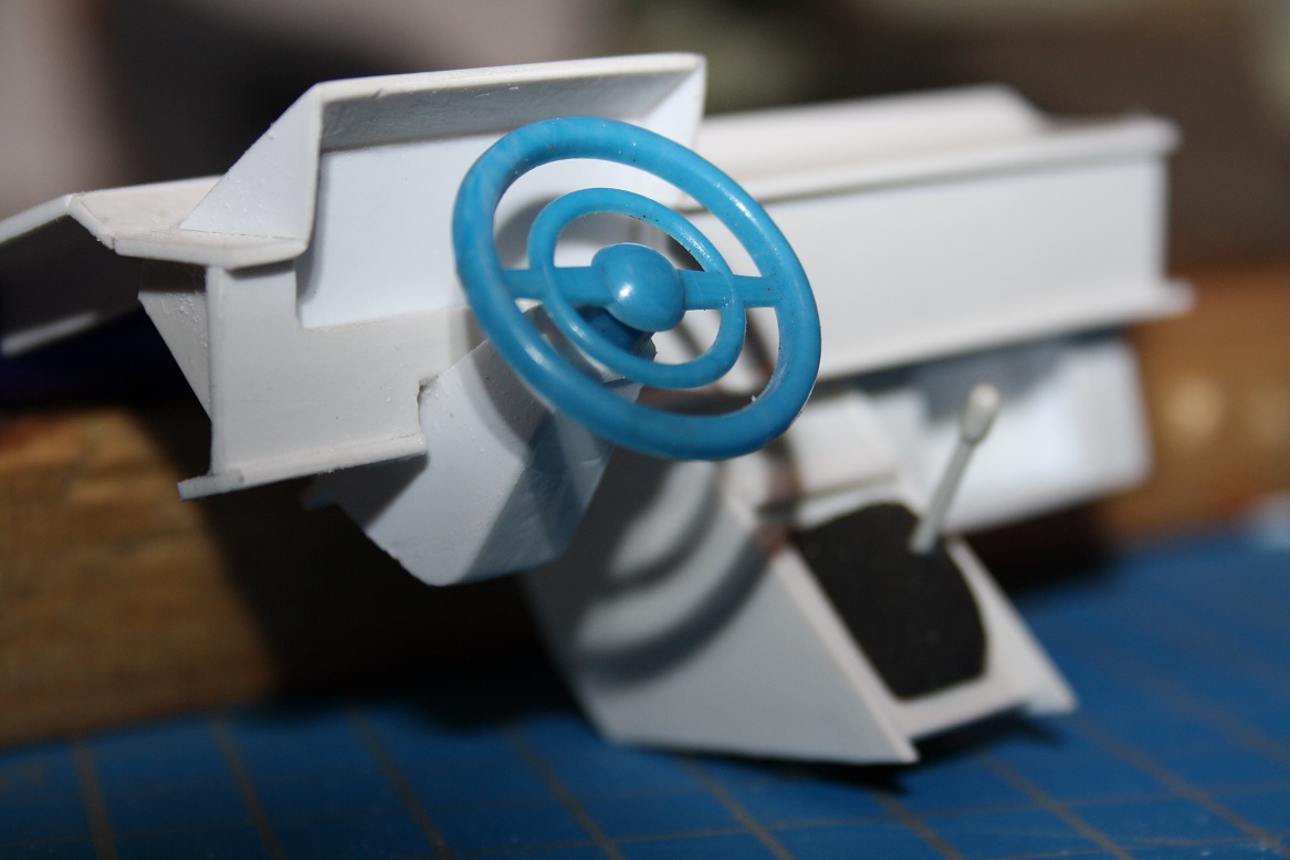 Schürze beigepinselt, Kennzeichen, Engelmänner, Zelle aus 2,5mm ABS, Lenkung, Sportsitze, Gurte, Rückbank raus, Endrohr aus einem Strohhalm, lackierte Türinnenseiten, ergo Wagenfarbe oben, Felgen über einen Freund.