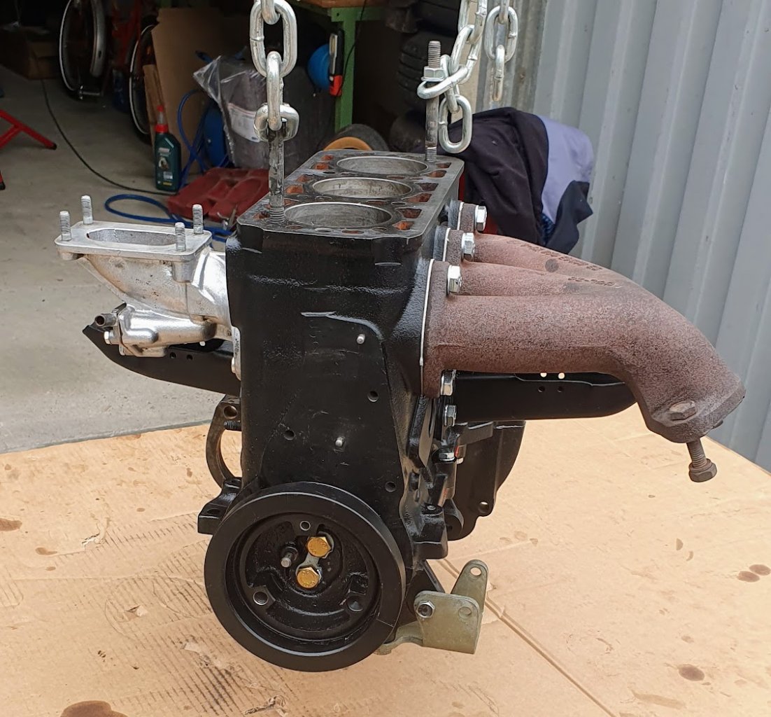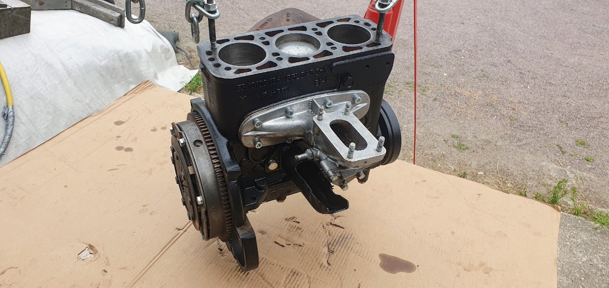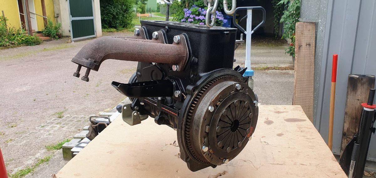 Zusammenbau relativ unproblematisch, wir haben den Motorblock mit 2 alten Stehbolzen versehen mit Balancer am Werkstattkran aufgehängt in den Wartburg eingeführt und mit dem Getriebe verheiratet. Der Wartburg steht bei mir ja noch auf der Arnoldbühne, also vorn etwas angehoben, was die Montage erleichtert da man von allen Seiten recht gut ran kommt.