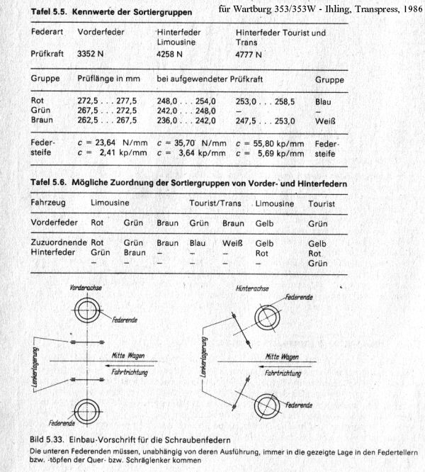 die Federn sind alle verschieden. Vorne hast Du noch die größte Ähnlichkeit zum 353W, die Federkonstante ist gleich, aber die Maße leicht geändert (wenn man den Anleitungen glauben darf), was im Federverhalten auffällt. Hinten hat der 1.3 ganz andere Kennwerte bei den Federn. Sicher: bautechnisch kannste alles in jeden Wartburg reinstecken, das hat aber nichts mehr mit solidem Arbeiten zu tun und die Auslegung wurde vom Werk auch nicht umsonst geändert. Der 1.3 ist serienmäßig wesentlich härter gefedert als der 353/353W. Ich würde zuerst mal an Deiner Stelle die ganzen Handbücher besorgen/sichten, die Federtypen vergleichen und dann weißt Du was Sache ist bzw. wonach Du suchen solltest.